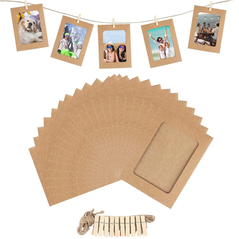 10 Cadres pour Photos 10x15 en Papier Kraft + 10 Pinces en bois + 1 Corde de chanvre pour Décoration Murale